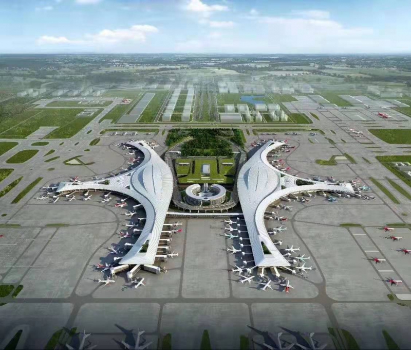 成都天府國際機(jī)場一期工程飛行區(qū)等級為4F,建設(shè)“兩縱一橫”共3條跑道、60萬平方米的航站樓、246個(gè)停機(jī)位以及相應(yīng)的空管工程、供油工程、航空公司基地工程等設(shè)施。